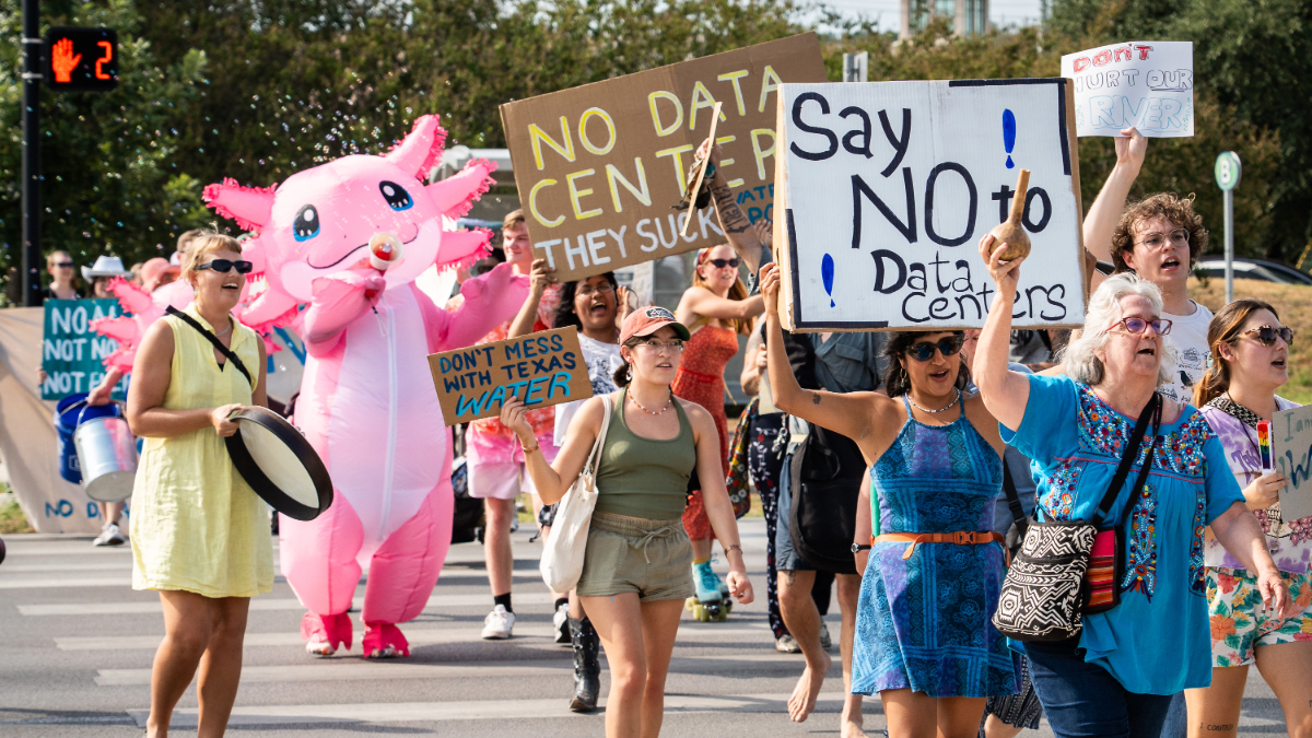 SAN MARCOS, TEXAS - AUGUST 19: Protesters walk together in the March for Water and a Sustainable Future. Activists marched for San Marcos City Park to City Hall to protest proposed data centers in the area. (Sara Diggins/The Austin American-Statesman via Getty Images)