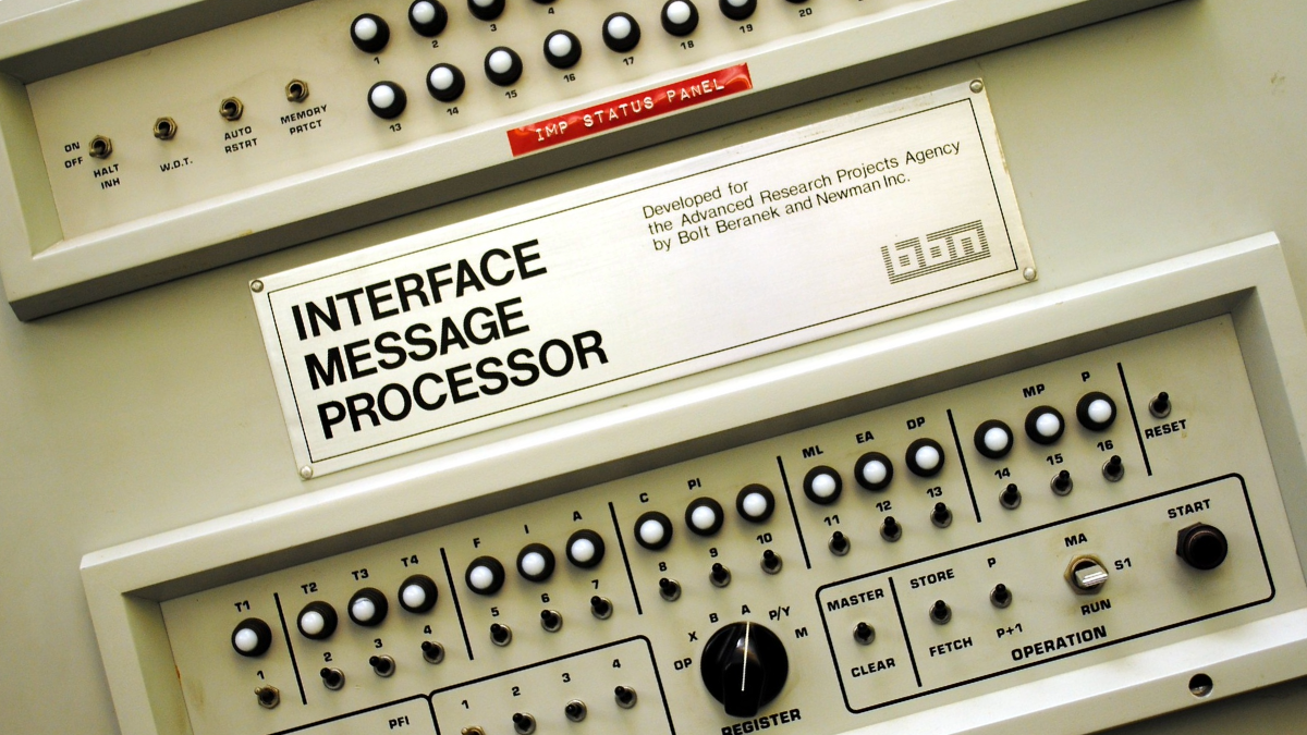 A photo of the front panel of the very first Interface Message Processor (IMP). This one was used at the UCLA Boelter 3420 lab to transmit the first message on the Internet. Wikimedia/CC by 3.0