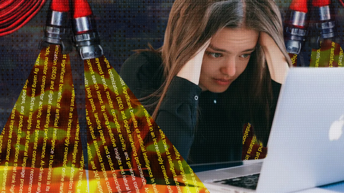 This image shows a white-collar office worker buried under stacks of paperwork while torrents resembling firehoses pour down around her. (Pauline Wee & DAIR / Better Images of AI)