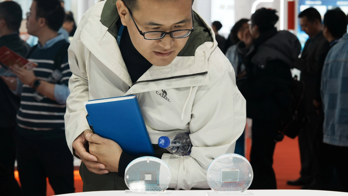 A man looks at AI chips exhibited at the SEMICON China 2026 in Shanghai, China, Wednesday, March 25, 2026. (FeatureChina via AP Images)