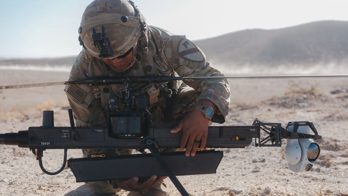 A solider checks an Anduril Industries Inc. Ghost-X reconnaissance drone at the National Training Center (NTC) in Fort Irwin, California, US, on Friday, Nov. 7, 2025. Christopher Lee/Bloomberg via Getty Images