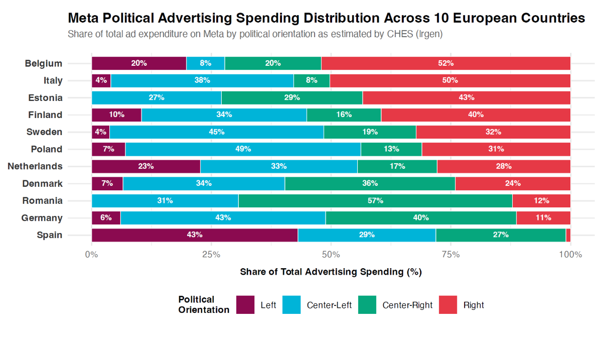 And who are these big spenders? Across the European countries I studied, it is overwhelmingly centrist parties. The graph below shows the distribution of political advertising spending by political orientation across ten countries in the EU. In eight out of ten countries, center-left and center-right parties combined account for half or more of all digital political ad spending on Meta. In some cases, like Germany and Denmark, centrist parties account for 70% or more of total spending.