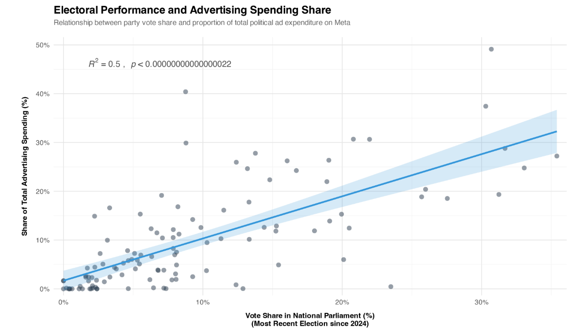 But let us assume the political ad ban is enforced properly after some initial hiccups. The more optimistic view is that banning digital ads levels the playing field, reducing the advantage of well-funded parties. There is some evidence in favor of that: the graph below, compiled with data from Who Targets Me, shows a clear correlation between advertising spending share and vote share, that is, parties that spend more on ads tend to be more successful. This is not because advertising is so powerful; in fact, research finds relatively small effects of political advertising, but larger parties simply have more resources at their disposal to spend on digital advertising.