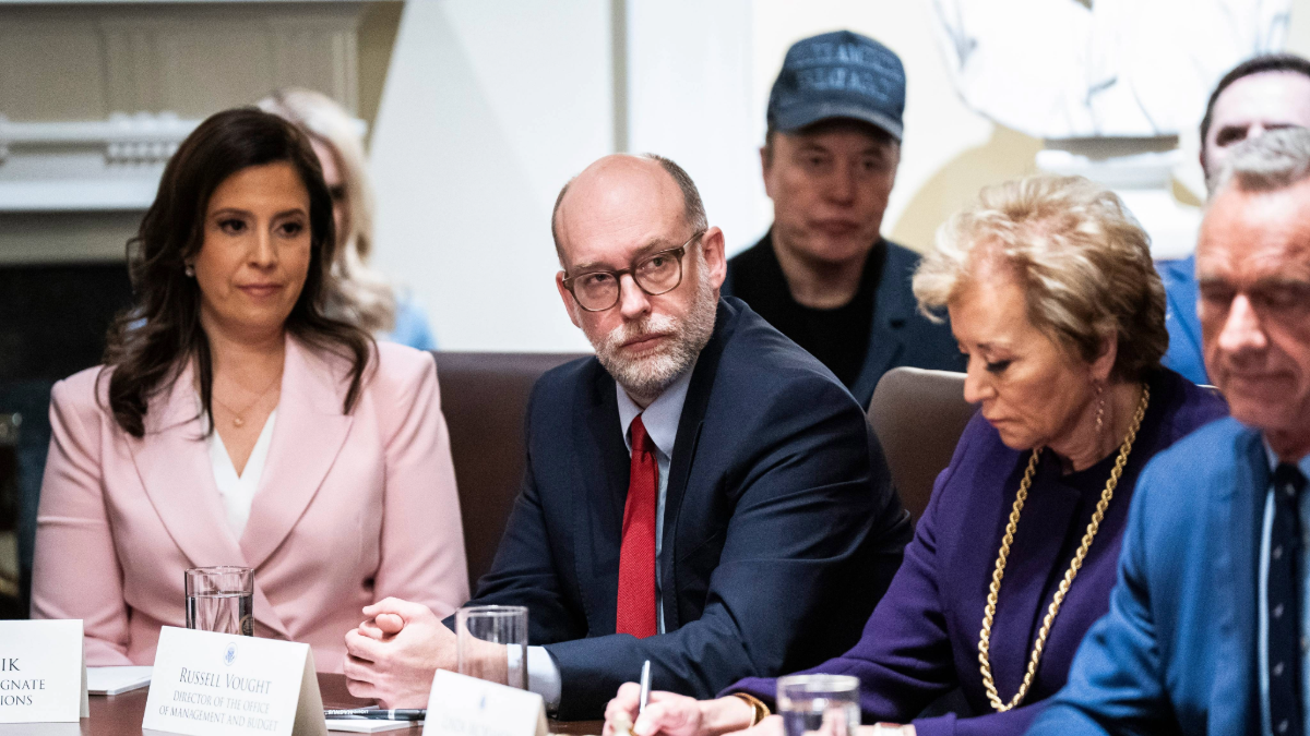 February 26, 2025: Director of the Office of Management and Budget Russell Vought listens at the first cabinet meeting of President Donald J. Trump's second term at the White House. (Photo by Jabin Botsford/The Washington Post via Getty Images)