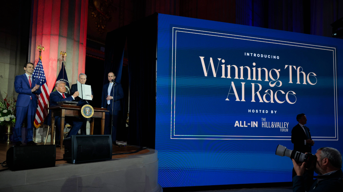 US President Donald Trump displays a signed executive order during the "Winning the AI Race" summit hosted by All‑In Podcast and Hill & Valley Forum at the Andrew W. Mellon Auditorium on July 23, 2025 in Washington, DC. (Photo by Chip Somodevilla/Getty Images)
