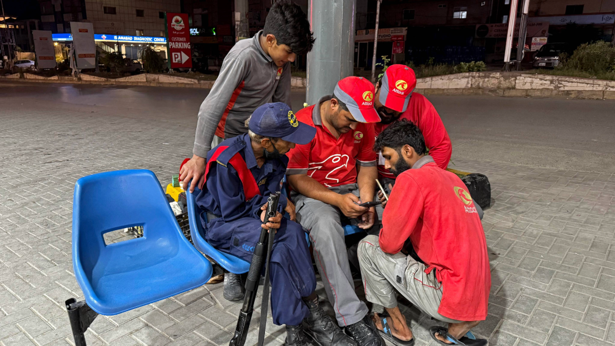 Employees watch news on a mobile phone at a fuel station in Islamabad on May 7, 2025. India fired missiles at Pakistani territory early on May 7 during an exchange of hostilities following a terrorist attack in India-administered Kashmir. (Photo by FAROOQ NAEEM/AFP via Getty Images)
