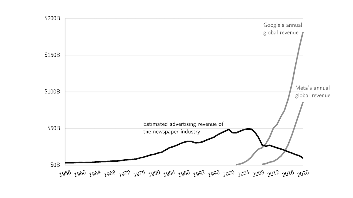 Estimated advertising revenue of the newspaper industry (sourced from the Newspapers Fact Sheet by Pew Research), Google's annual revenue (sourced from Statista), and Meta's annual revenue (sourced from Statista).