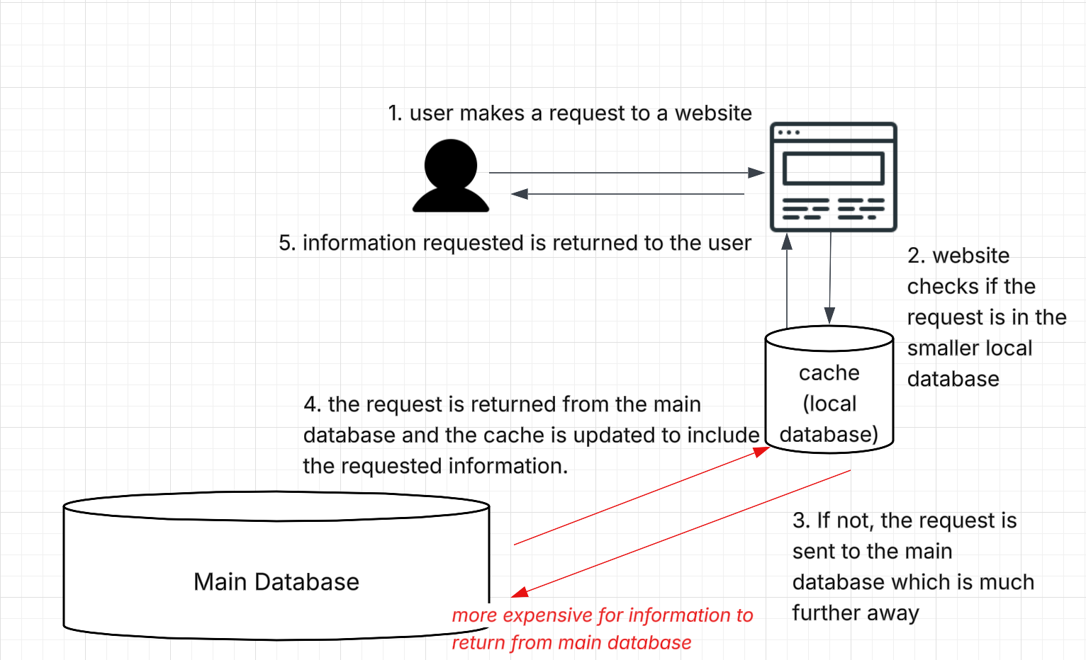 However, if the requested information is not found in the smaller local data center or cache, then the request goes to the main data center where all the website’s information is stored. This is more expensive and time consuming as the request/returned information has to traverse further. Most bot traffic gets passed onto the main data center as crawlers visit any link on a webpage, including the less visited ones. When requested information is returned by the main database, the local cache is automatically updated to include the requested information (the oldest requested information in the cache is removed to make space for the new information coming in from the main database). This process of how information requested over the internet is provided to a person is illustrated below.