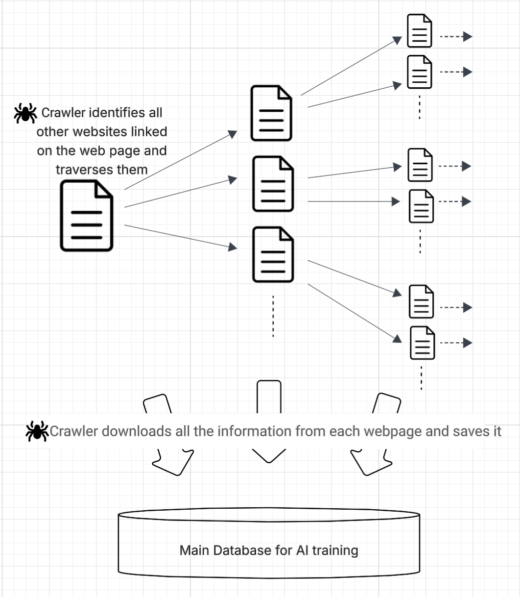 The process is iterative: the crawler visits a page, downloads its content (which, after processing, can become AI training data), identifies all linked websites and proceeds to download content from these linked websites, then it moves to the links on those websites and so on. The action continues until the crawler runs out of links or is manually stopped.