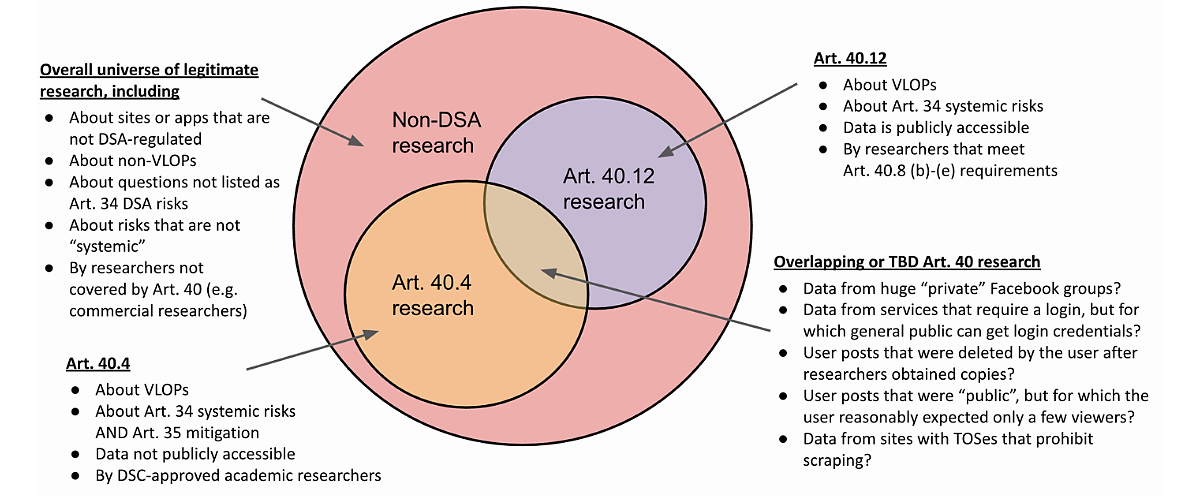 Non-DSA researchers won’t be directly protected by Article 40, but they may still benefit if the DSA drives more flexible or clearer interpretations of other laws. Courts assessing the rights of DSA researchers might, for example, arrive at research-protective interpretations of the text and data mining exceptions to the DSM Copyright Directive, national contract law and terms of service, or the GDPR’s “legitimate interests” basis for processing personal data. If interpretations of these other laws open the door to legitimate research generally, and not solely under the DSA, it will benefit the broader research community.