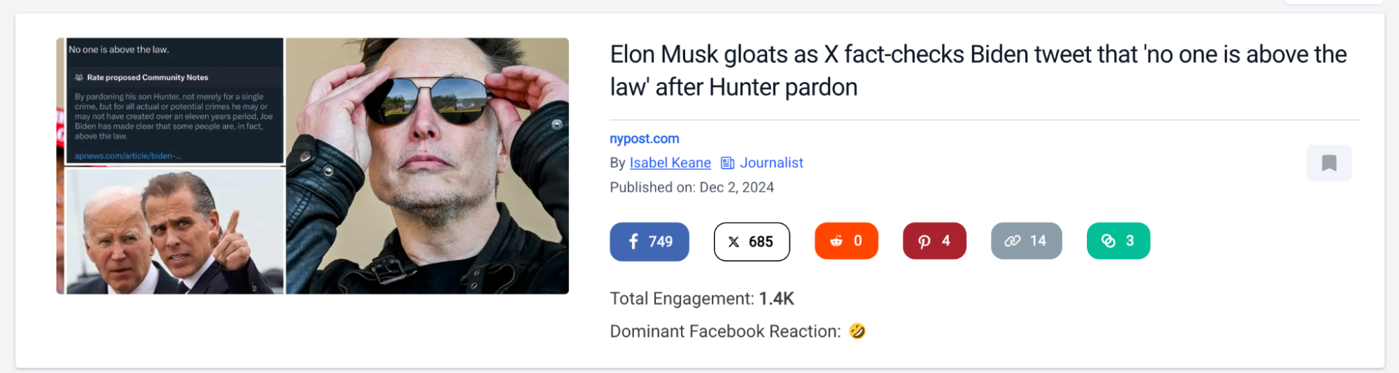 This influence doesn’t end with Musk’s posts. A BuzzSumo analysis conducted on April 8, 2025, shows that even secondary reporting on Musk’s sarcastic reactions goes viral. One example is a New York Post story headlined “Elon Musk gloats as X fact-checks Biden tweet that ‘no one is above the law’ after Hunter pardon,” which generated significant traction across platforms, with a dominant Facebook reaction of laughter. Despite being just one of many stories covering Musk’s post, the article drew over 1.4K engagements, indicating how Musk’s narrative cues cascade across the media ecosystem and are rewarded with emotional amplification—in this case, mockery and ridicule. His digital rhetoric doesn’t just spread; it sets the tone for how others frame, interpret, and spread it further.