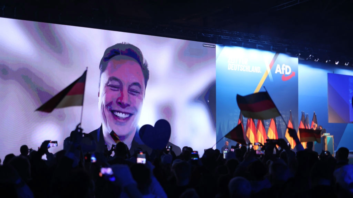 Tech billionaire Elon Musk speaks live via a video transmission during a speech by Alice Weidel, chancellor candidate of the far-right Alternative for Germany (AfD) political party, at the AfD election campaign launch rally on January 25, 2025 in Halle, Germany. (Photo by Sean Gallup/Getty Images)
