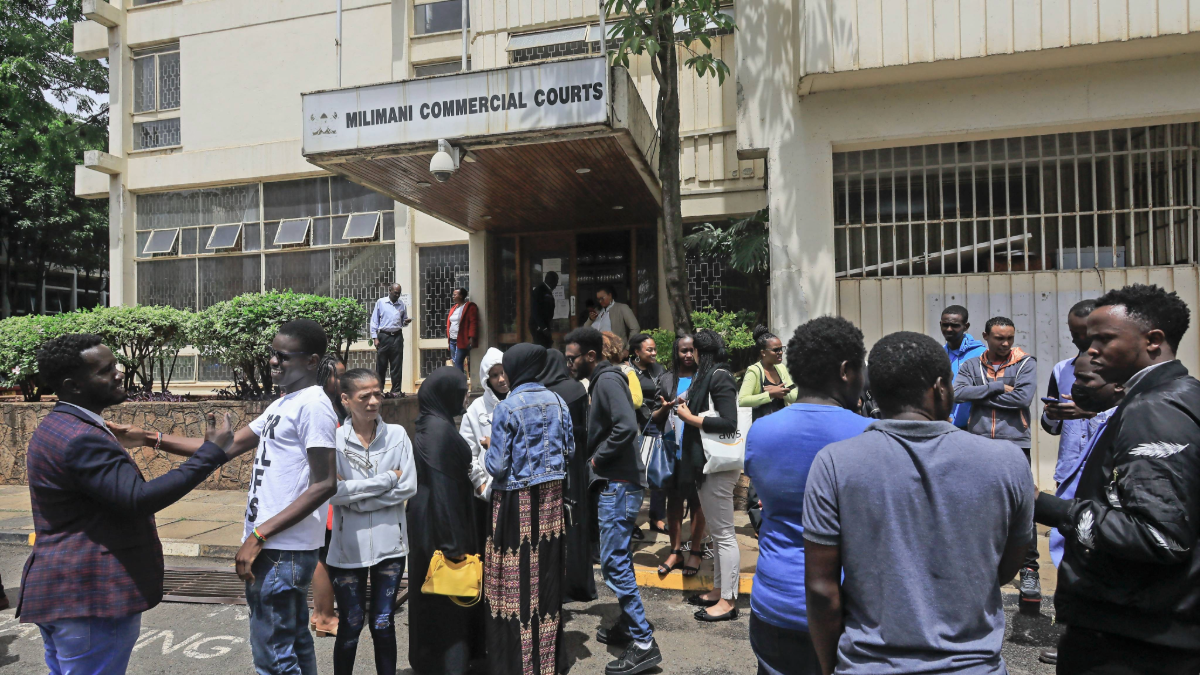 Nairobi—Some content moderators for Facebook gather to consult with their lawyer, Mercy Mutemi (unseen), outside the labor court in Milimani, where they filed a complaint in Kenya against Meta, on April 12, 2023. (Photo by TONY KARUMBA/AFP via Getty Images)