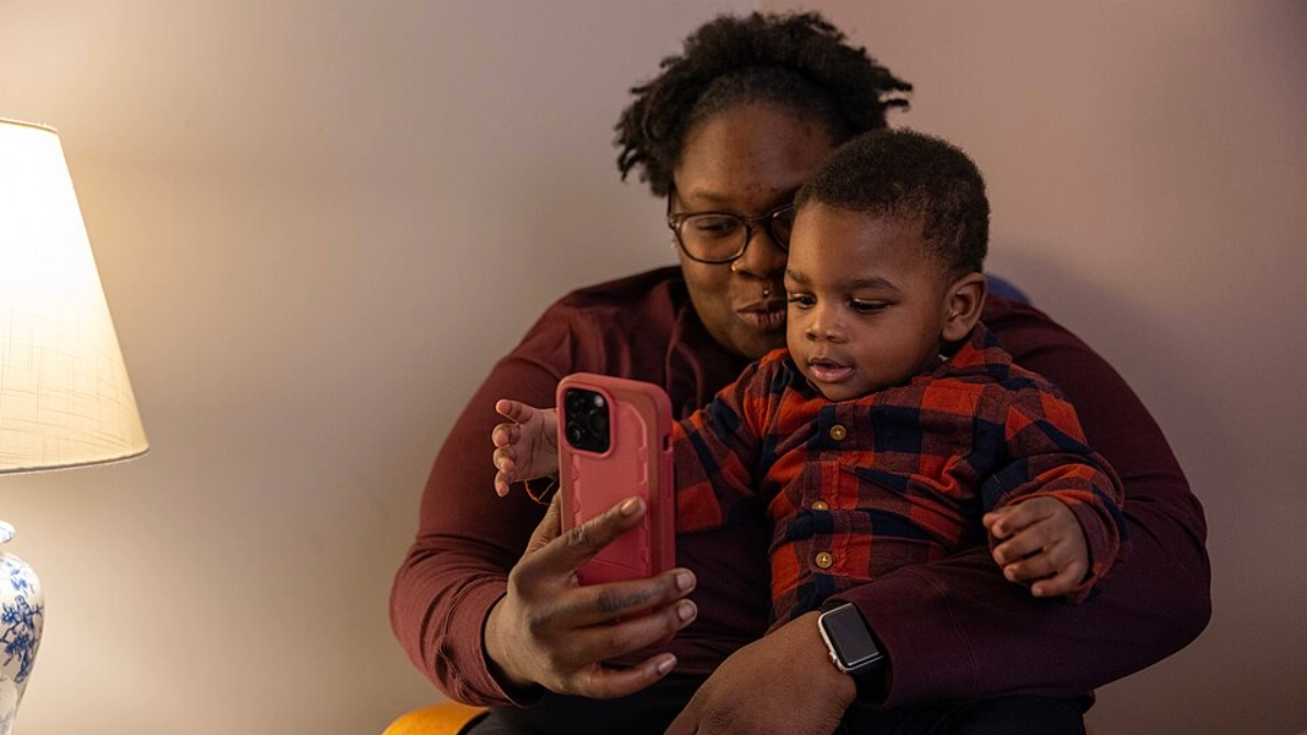 A parent and child participate in a nutrition program via digital platform on their phone in Mt. Pleasant, South Carolina, in February 2025. (USDA)