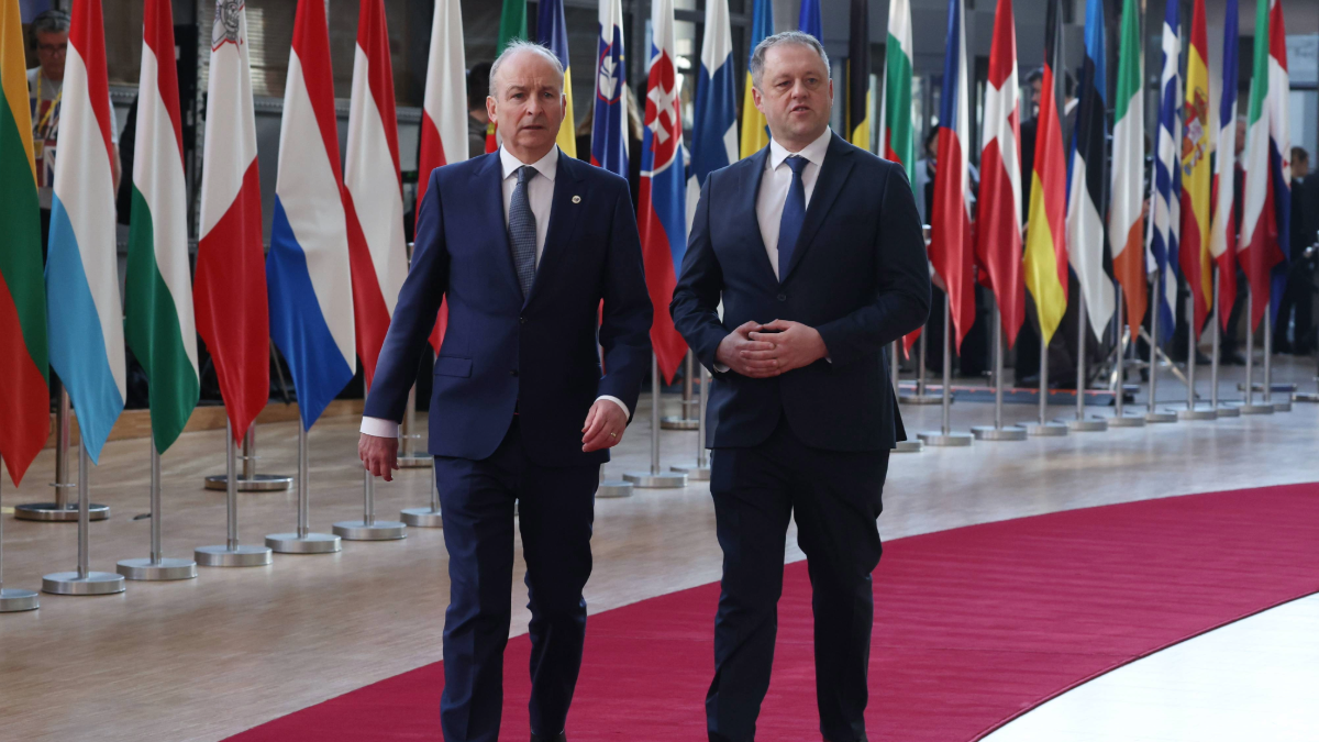 Ireland's Prime Minister Michael Martin, left, arrives for the EU summit at the European Council building in Brussels, Thursday, March 19, 2026. (AP Photo/Omar Havana)