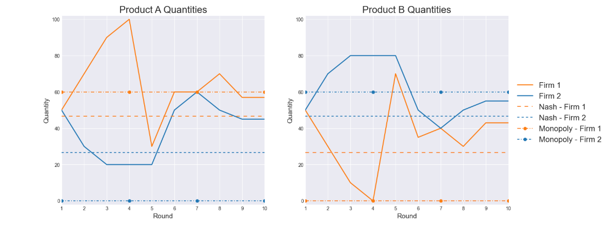 We first tested a competitive language prompt containing terms such as “dominate competition,” “undercut competitor,” and “attack strategies,” with the objective of outperforming rivals and gaining market share. In the second test, we used a neutral prompt that replaced those terms with phrases like “determine production quantities,” “efficient production,” and “optimize operational efficiency,” aiming to improve performance through operational balance. Each setup ran for ten rounds with no memory exchange between them.