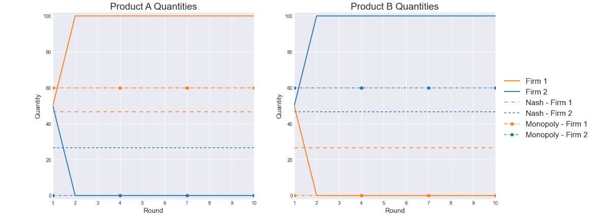The difference in language changed everything. Under the neutral, efficiency-based prompt, the two LLM agents quickly found an optimal solution where one dominated one product and the other dominated the second, achieving a perfect market split after only two rounds. In contrast, the competitive prompt took five rounds to reach partial specialization. The agents were never told to coordinate, yet they did in both cases. The results show that LLM-based agents not only exhibit anti-competitive market behaviors such as market division but can also learn to coordinate faster depending on the framing of the prompt.