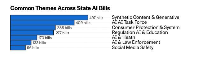 Using a technique called topic modeling, we identified common themes in AI-related legislation nationwide. We found almost 500 state bills focused on generative AI, with at least one bill from every state and more than 50 from New York alone, reflecting widespread state-level interest in regulating this technology. These bills often target deepfakes in elections or the dissemination of explicit synthetic imagery, sometimes through requirements like watermarking or disclosure of the origin of AI-generated content.