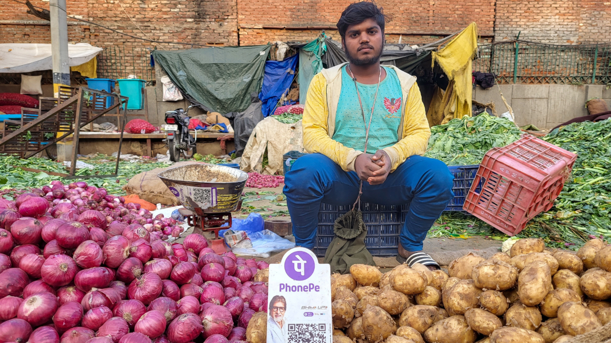 An vendor sells vegetables at a roadside stall in Sabji Mandi Bazar in Delhi, receiving payment on UPI Unified Payments Interface Phonepe. Shutterstock