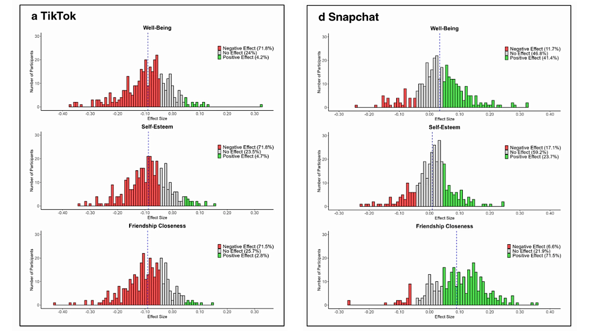 The team recruited 479 14-18 year olds in the Netherlands and gave them an initial survey to gather demographic, social media habits and psychological baseline information. They then administered financially-incentivized daily questionnaires regarding each subject’s use of social media platforms that day and three specific dimensions of their psychology. These were: well-being, self-esteem, and friendship closeness—selected for their salience for mental health in this age group.