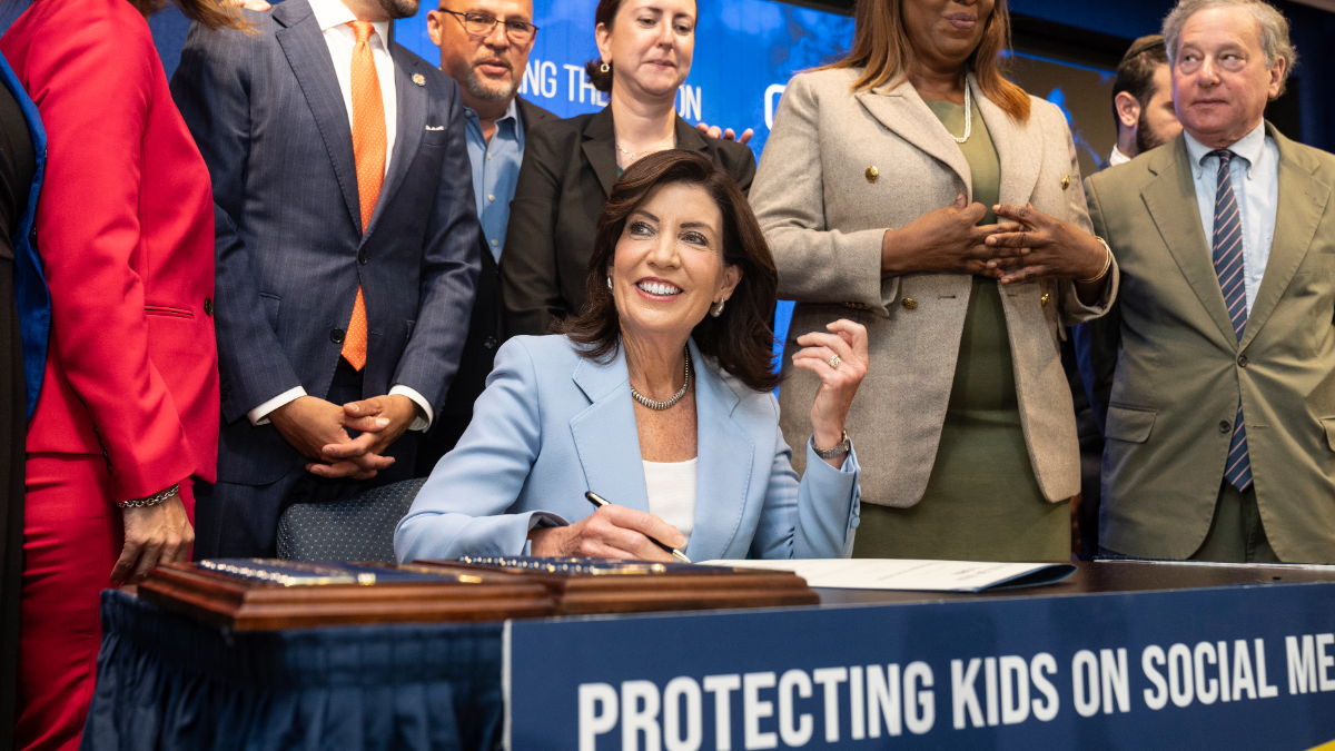 New York Governor Kathy Hochul (D) signed legislation to combat addictive social media feeds and protect kids at UFT Headquarters in New York on June 20, 2024. (Photo by Lev Radin/Sipa USA via AP Images)