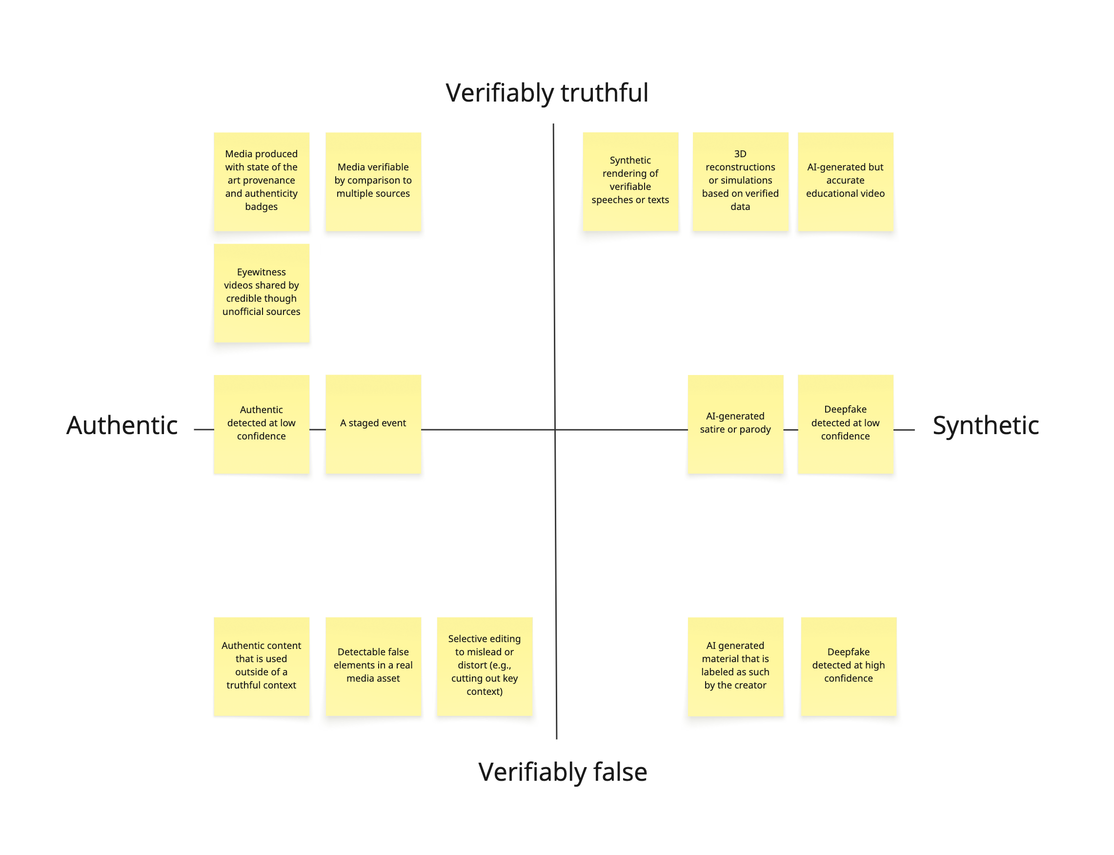 Illustration: A matrix categorizing media content by its authenticity (Authentic vs. Synthetic) and veracity (Verifiably True vs. Verifiably False), with examples.