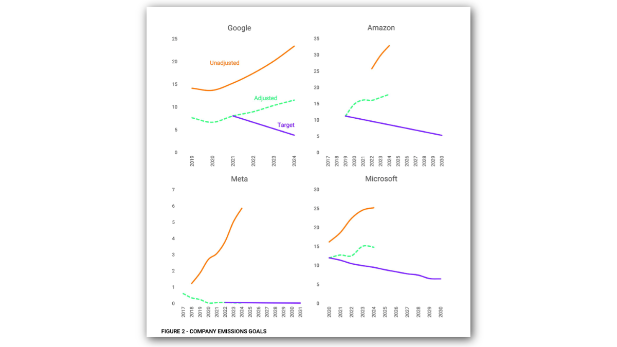 “These charts show compiled emissions data for four major tech companies compared to the trajectory of targets they set in recent years.” Source