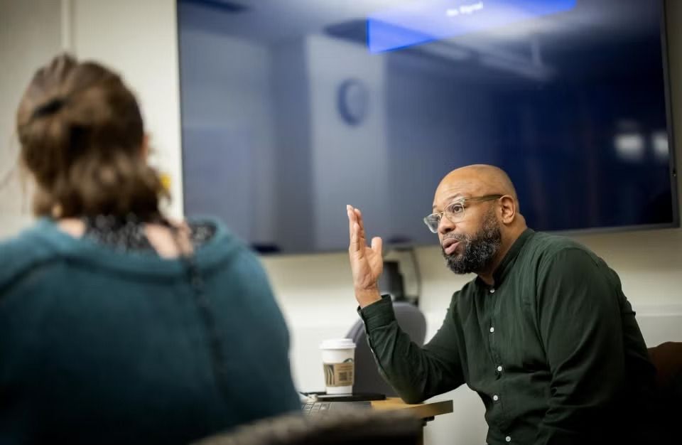 Desmond Patton speaks with a student during the Journey to Joy class. (Photo: Eric Sucar/University of Pennsylvania)