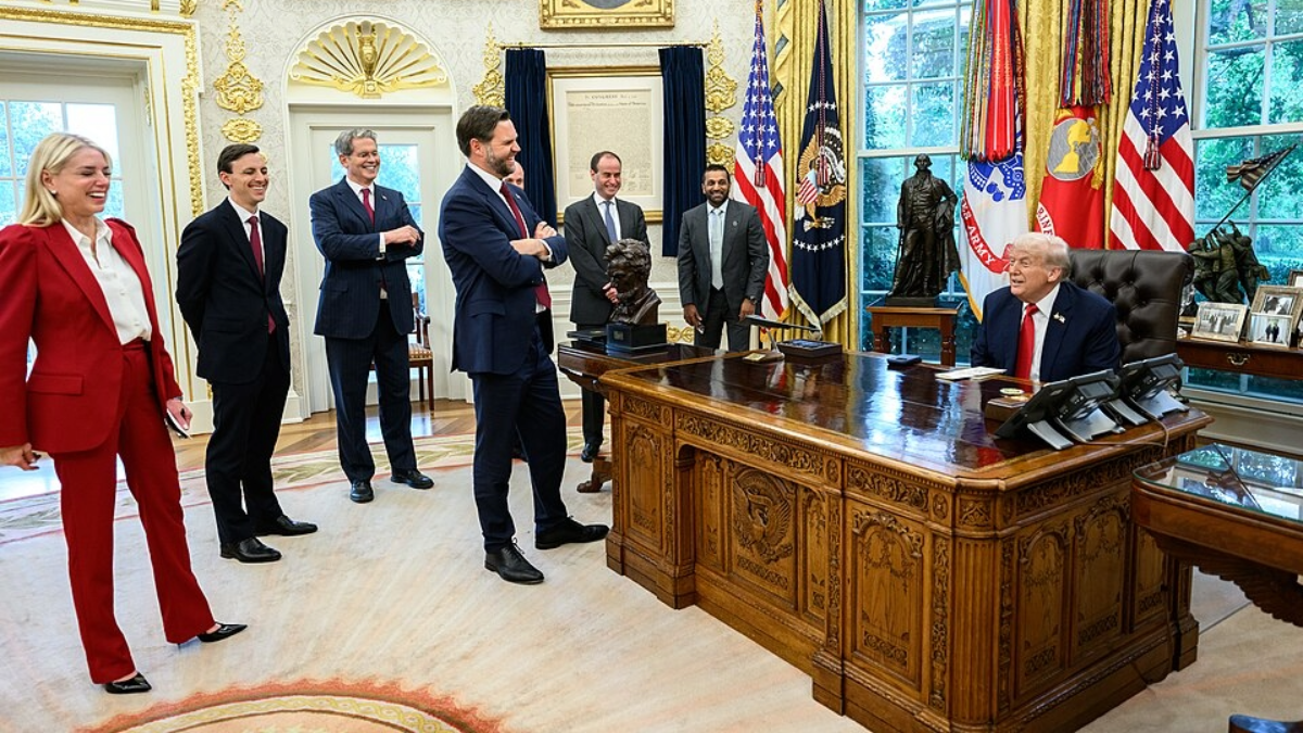 President Donald Trump speaks with Vice President JD Vance and others before signing an executive order greenlighting a US deal for TikTok, September 25, in the Oval Office. (Official White House Photo by Joyce N. Boghosian)