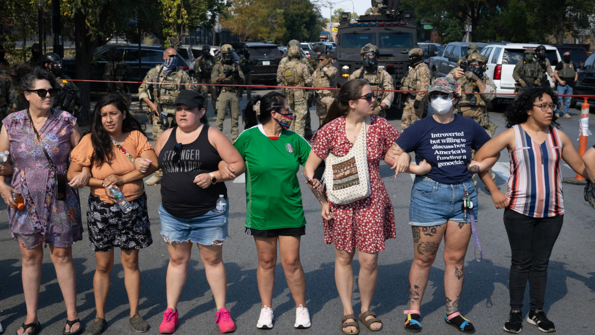 CHICAGO, ILLINOIS—OCTOBER 4, 2025: Community members and activists confront Federal law enforcement agents for reportedly shooting a woman in the Brighton Park neighborhood in Broadview, Illinois. (Photo by Scott Olson/Getty Images)