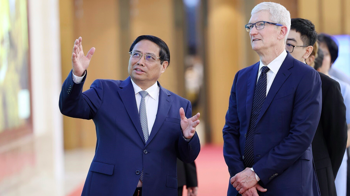 Vietnamese Prime Minister Pham Minh Chinh, left, speaks to Apple CEO Tim Cook, right, before their meeting in Hanoi, Vietnam, in April 2024. (Duong Van Giang/VNA via AP)