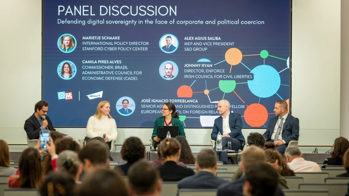 Panelists discuss threats to Europe's digital sovereignty during the Open Markets Institute and ARTICLE 19 conference in Brussels on October 15, 2025. Source: Article 19