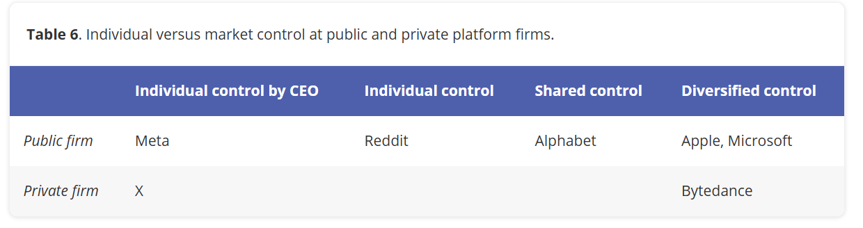 Leerssen has classified the platforms’ control models. X is at one extreme: a private company under the control of one individual who is also its manager (although Elon Musk is not technically the CEO of X, he is the CEO of xAI Holding Corp., X’s parent entity). At the other are Apple and Microsoft: public companies with institutional investors having the largest shares. The platforms in between run the gamut: Meta, a public company with a largest-shareholder CEO who retains overall control of the company thanks to a dual-class share system; recently-public Reddit, where the majority shareholders proxy their board votes to the CEO; Google parent Alphabet, a public company with individual owners sharing control; and the private ByteDance, which is (as far as Leerssen can tell) majority-owned by institutional investors.