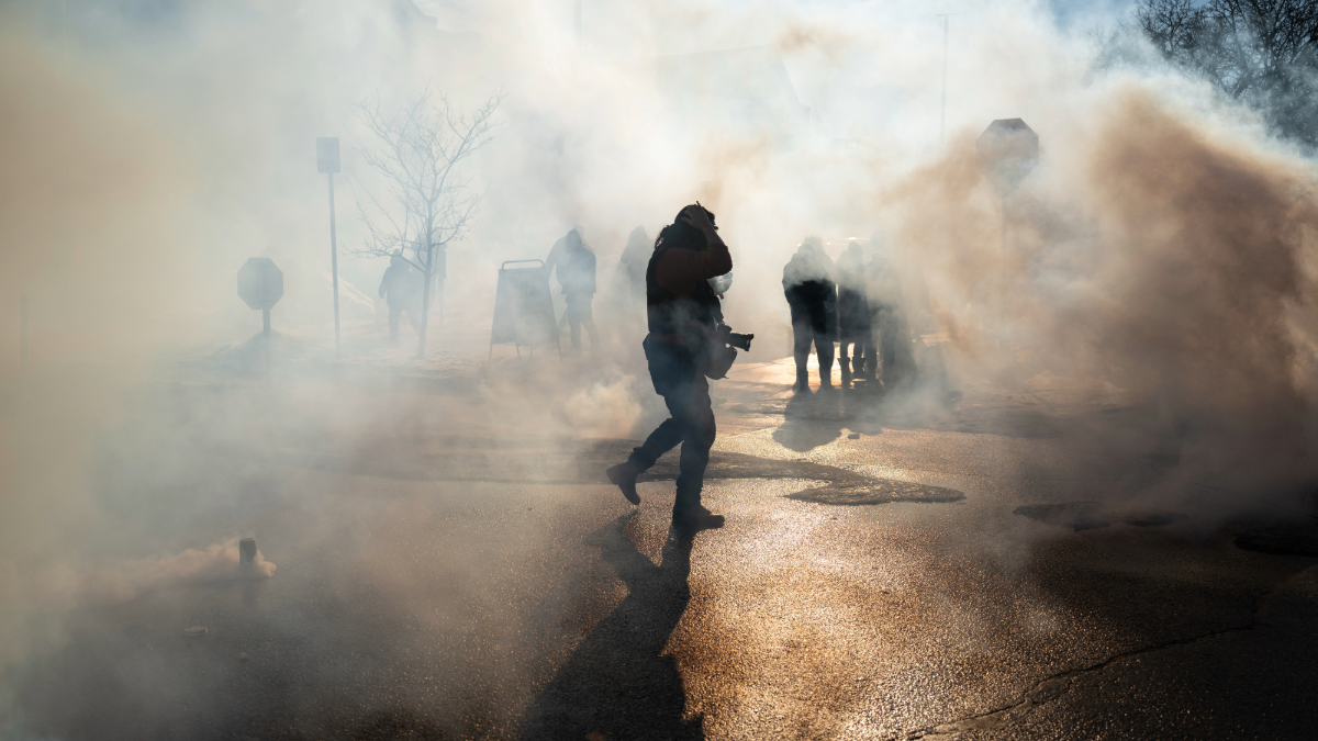 Onlookers and demonstrators walk through tear gas after confronting federal law enforcement agents during a raid in south Minneapolis, Minnesota, US, on Tuesday, Jan. 13, 2026. Photographer: Victor J. Blue/Bloomberg via Getty Images