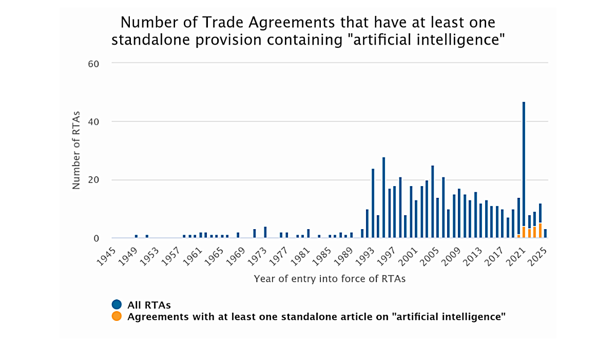 After 2020, while a large number of trade agreements mentioned ‘artificial intelligence’ in some context, only 18 trade agreements provided for AI to some extent; the language of these provisions is largely aspirational and endeavor-based. According to WTO’s World Trade Report, as of October 2025, only 2 per cent of all Regional Trade Agreements and Digital Economy Agreements worldwide incorporate any explicit AI-related provision. These clauses generally acknowledge AI’s potential for social and economic benefit but rarely move beyond declaratory intent, mirroring how e-commerce was acknowledged but not institutionalized in the early days of trade policy.