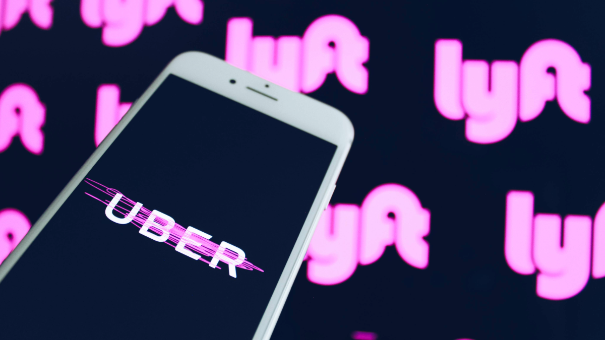 The Uber and Lyft logos displayed on a phone and backdrop. (Stock Catalog)