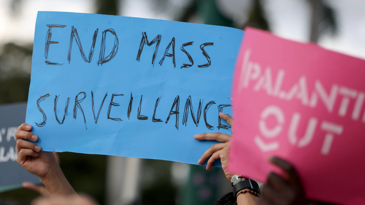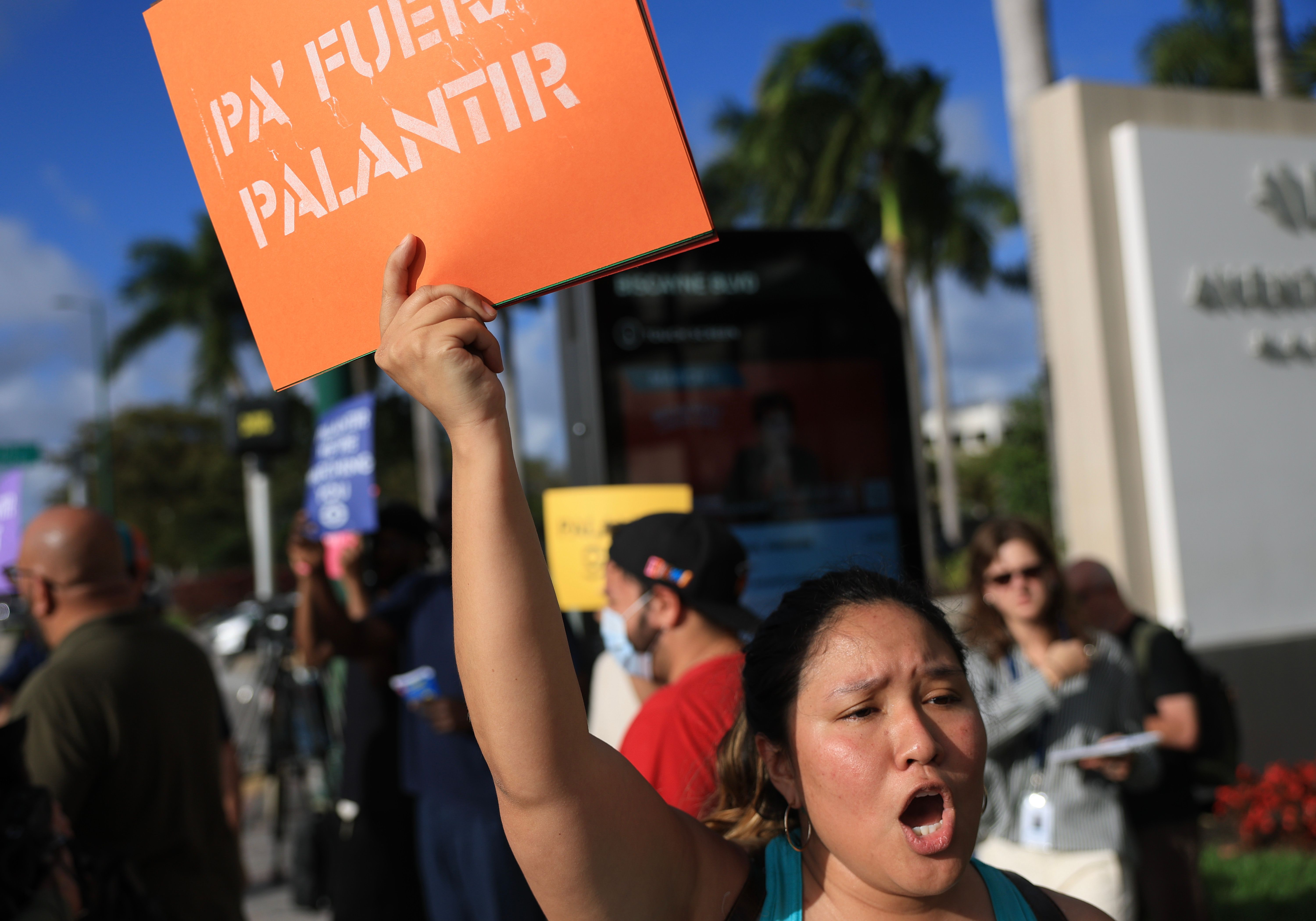 Protesters make themselves heard near Palantir’s new headquarters on March 3, 2026 in Aventura, Florida. The activists accuse them of enabling surveillance, deportations, and human rights violations. (Photo by Joe Raedle/Getty Images)